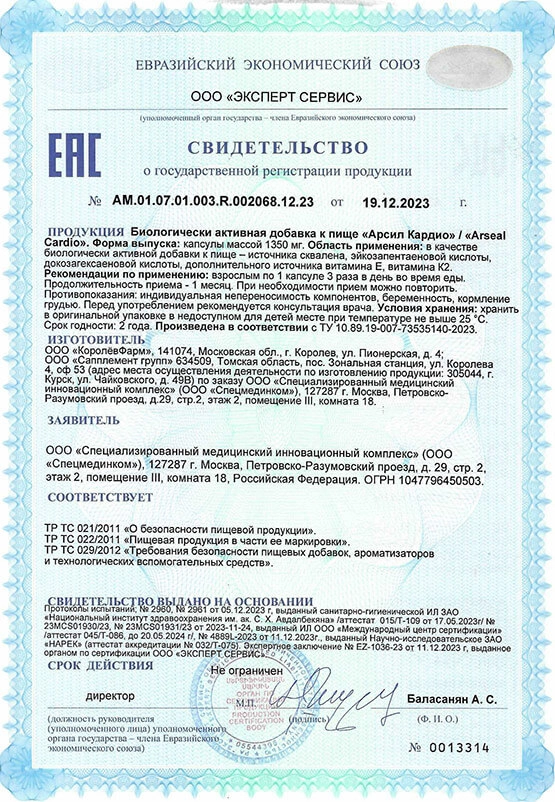 Арсил Кардио не является лекарственным препаратом и не может заменять назначенную врачом медикаментозную терапию. При сердечно-сосудистых заболеваниях продукт применяется исключительно в качестве дополнительного средства в составе комплексной программы. Не следует самостоятельно отменять или корректировать дозировки назначенных врачом кардиологических препаратов.