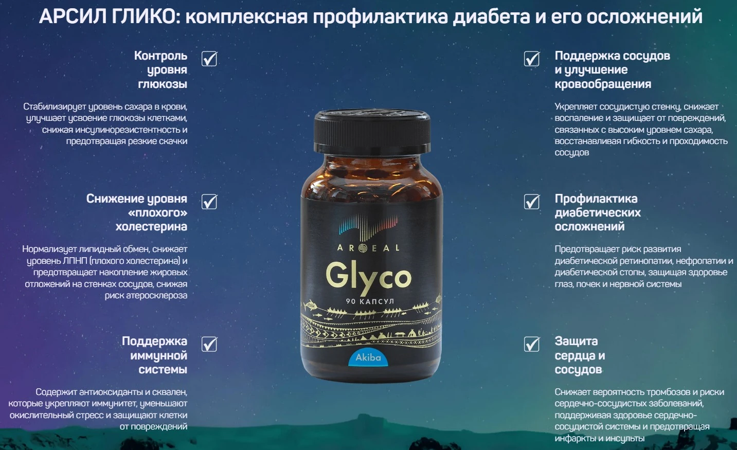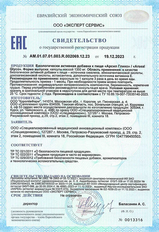Арсил Глико — натуральный комплекс в форме мягких капсул на основе тюленьего жира Акиба, разработанный для поддержки нормального уровня сахара в крови и защиты сосудистой системы. Средство содержит 24 вида жирных кислот, сквален, астаксантин и комплекс витаминов, которые в совокупности способствуют нормализации углеводного и липидного обмена. Арсил Глико не является лекарственным препаратом и применяется в качестве биологически активной добавки к пище.