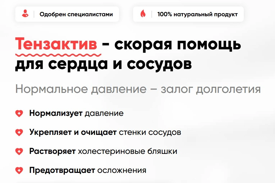 Среди людей старше 50 лет гипертонией больны более 60% населения. В большинстве случаев гипертонии сопутствуют нарушение липидного обмена (повышенный холестерин), сосудистые нарушения, что ведёт к самым страшным последствиям: инфаркту и инсульту. Проблема традиционных лекарств в том, что они не лечат, а только купируют симптомы — люди вынуждены принимать таблетки постоянно, добавляя всё новые препараты, что негативно влияет на весь организм. Капсулы для сердца и сосудов Тензактив решают эту проблему принципиально иначе: устраняют саму причину повышения давления, а не просто снимают симптомы. Уникальная формула сочетает действие четырёх препаратов в одной капсуле: стабильное снижение давления, нормализация сердечного ритма, снижение холестерина и снятие тревоги. Облегчение симптомов происходит с первого приёма, а курсовой приём обеспечивает профилактику инфарктов и инсультов, возвращая молодость сосудам. Натуральный состав не содержит ГМО, не вызывает побочных действий и привыкания.