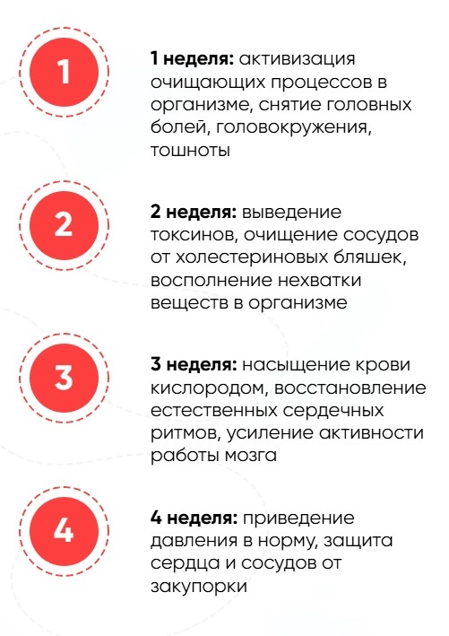 Нано-грануляция содержимого обеспечивает пролонгированное 24-часовое действие: 1 капсула предотвращает повышение давления на протяжении суток. Облегчение симптомов происходит с первого приёма. Для полного избавления от опасности инфарктов и инсультов требуется пропить несколько курсов по 30 дней. Рекомендуемый минимальный курс — 30 дней. При необходимости курс повторяется после небольшого перерыва.