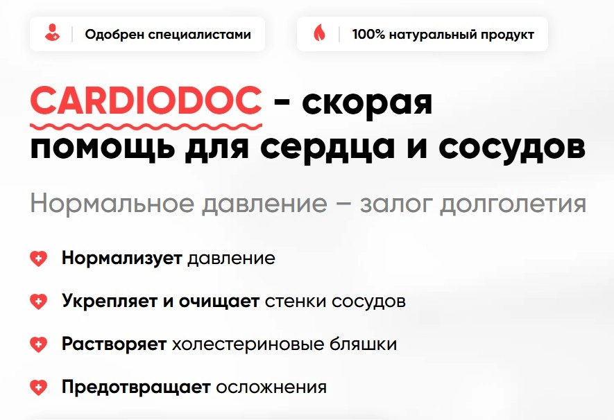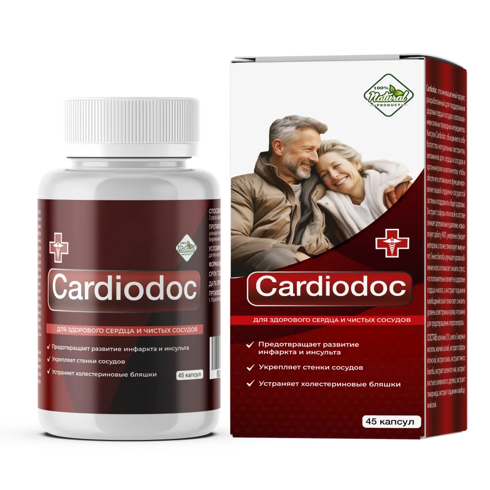 Кардиодок (Cardiodoc) — комплексная биологически активная добавка в форме капсул от давления, разработанная для поддержания здоровья сердечно-сосудистой системы, нормализации артериального давления и предотвращения развития сердечно-сосудистых заболеваний. Капсулы от давления Кардиодок содержат тщательно подобранный комплекс из 11 натуральных биоактивных компонентов: коэнзим Q10, омега-3 жирные кислоты, магний, калий, экстракты софоры японской, амлы, гинкго билоба, зелёного чая, листьев оливкового дерева, тамаринда и гарцинии камбоджийской. Натуральные растительные экстракты регулируют частоту сердечных сокращений, тонизируют сердечную мышцу, очищают сосуды и укрепляют их стенки.