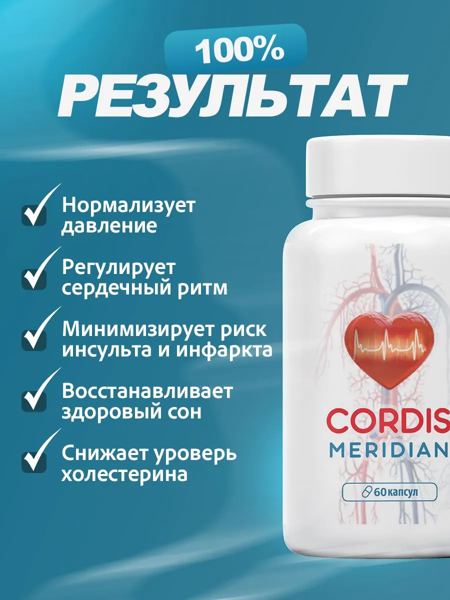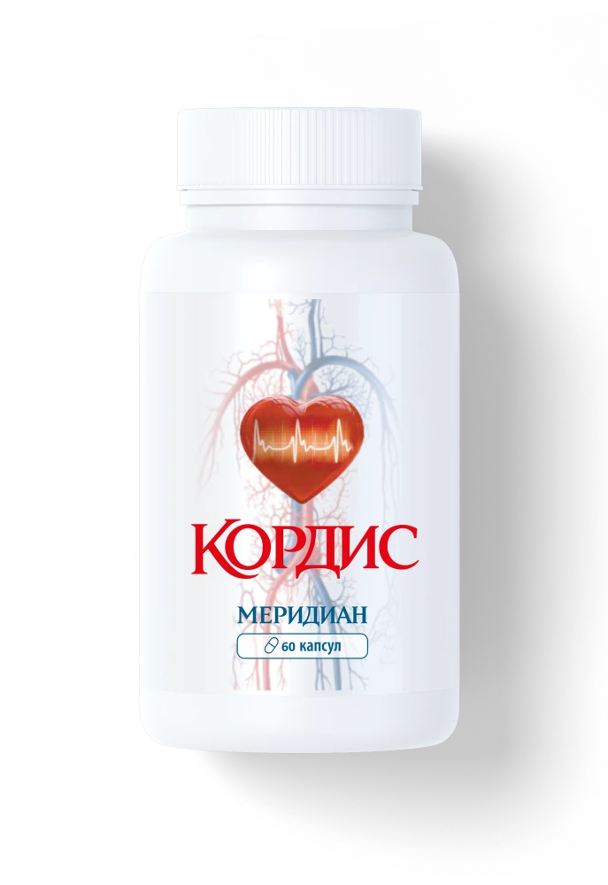 Кордис Меридиан (Cordis Meridian) — современный натуральный комплекс в форме капсул от давления, разработанный российскими учёными Центра клинической кардиологии им. А.Л. Мясникова Минздрава РФ для эффективной и безопасной борьбы с артериальной гипертензией. Капсулы от давления Кордис Меридиан содержат 10 натуральных растительных компонентов: австралийский квандонг, боярышник, бразильские ягоды асаи, витамин Е, центелла азиатская (готу кола), канадская голубика, кактус худия гордони, плоды манго, шиповник и индийский финик тамаринд. Формула действует комплексно: снижает артериальное давление, расширяет и укрепляет сосуды, рассасывает холестериновые бляшки, нормализует сердечный ритм, выводит токсины и лишнюю жидкость. В отличие от обычных гипотензивных средств, эффект сохраняется даже после отмены приёма. Препарат не вызывает привыкания, имеет минимум побочных эффектов и подходит для пациентов любого возраста. Принимается по 1 капсуле 2 раза в день во время еды.