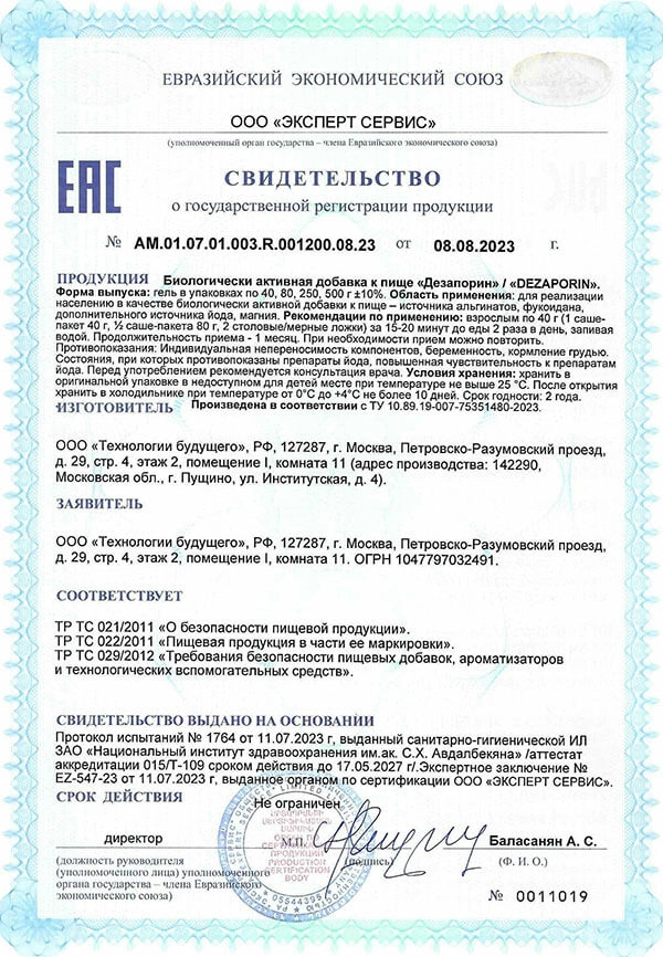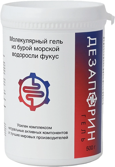 Дезапорин Гель — многофункциональный противозапорный гель на основе морской бурой водоросли фукус, разработанный российскими учёными в наукограде Пущино. Продукт обеспечивает полный цикл действий: послабление, очищение, заживление и восстановление желудочно-кишечного тракта. В состав входят запатентованные компоненты Nigellin и Sabeet, фукоидан, альгинаты, водорослевая клетчатка, инулин, цитрат магния, натуральные масла тыквы и облепихи, экстракты лопуха, алоэ, свёклы и корицы. Дезапорин Гель не является лекарственным препаратом — это диетическое (лечебное) питание для приёма внутрь.