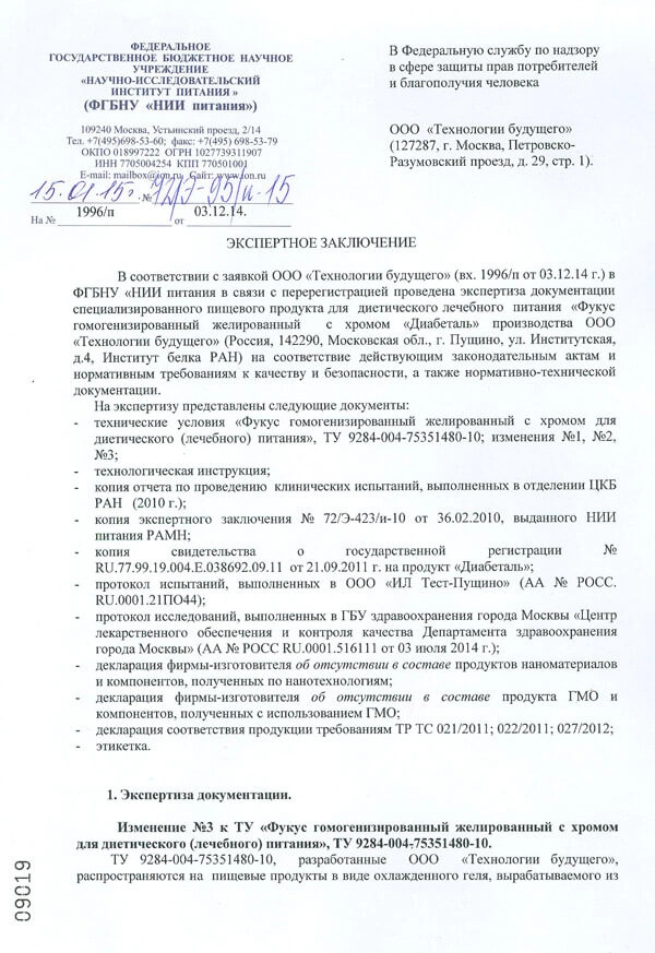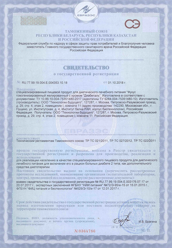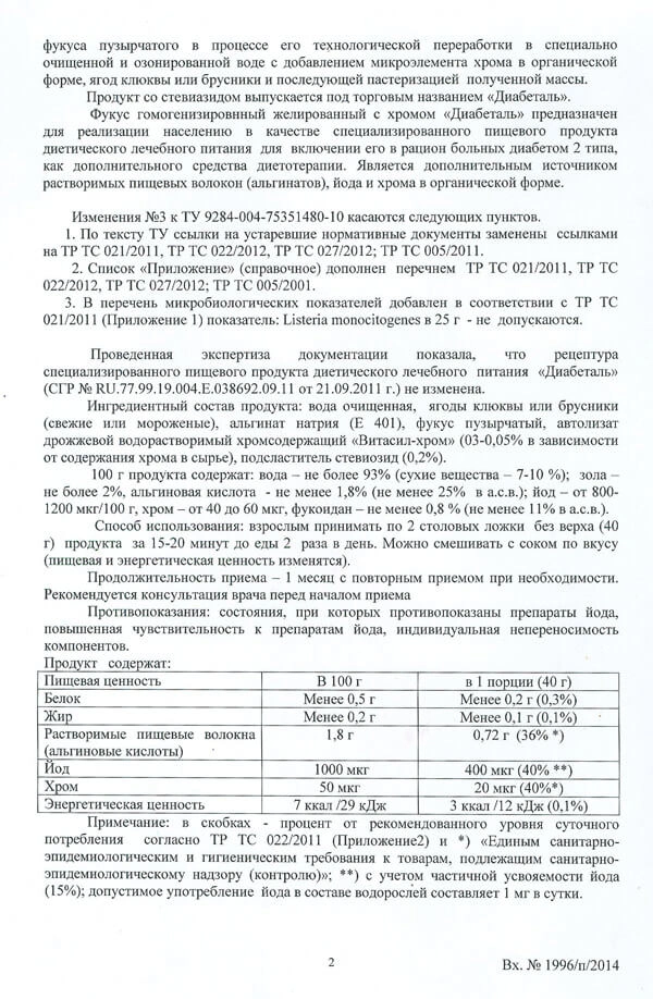 Продукт лечебно-диетического питания. Гель на основе морской водоросли фукус (Белое море) с уникальным компонентом L-фукозой для нормализации уровня сахара в крови при сахарном диабете. Содержит 42 жизненно необходимых элемента. Не является лекарственным средством и не является БАД. Испытан в Центральной клинической больнице Российской Академии Наук. Сертифицирован в Евросоюзе.
