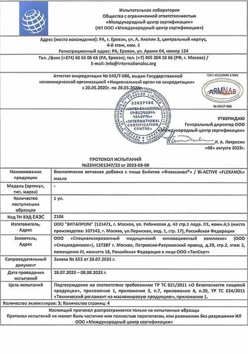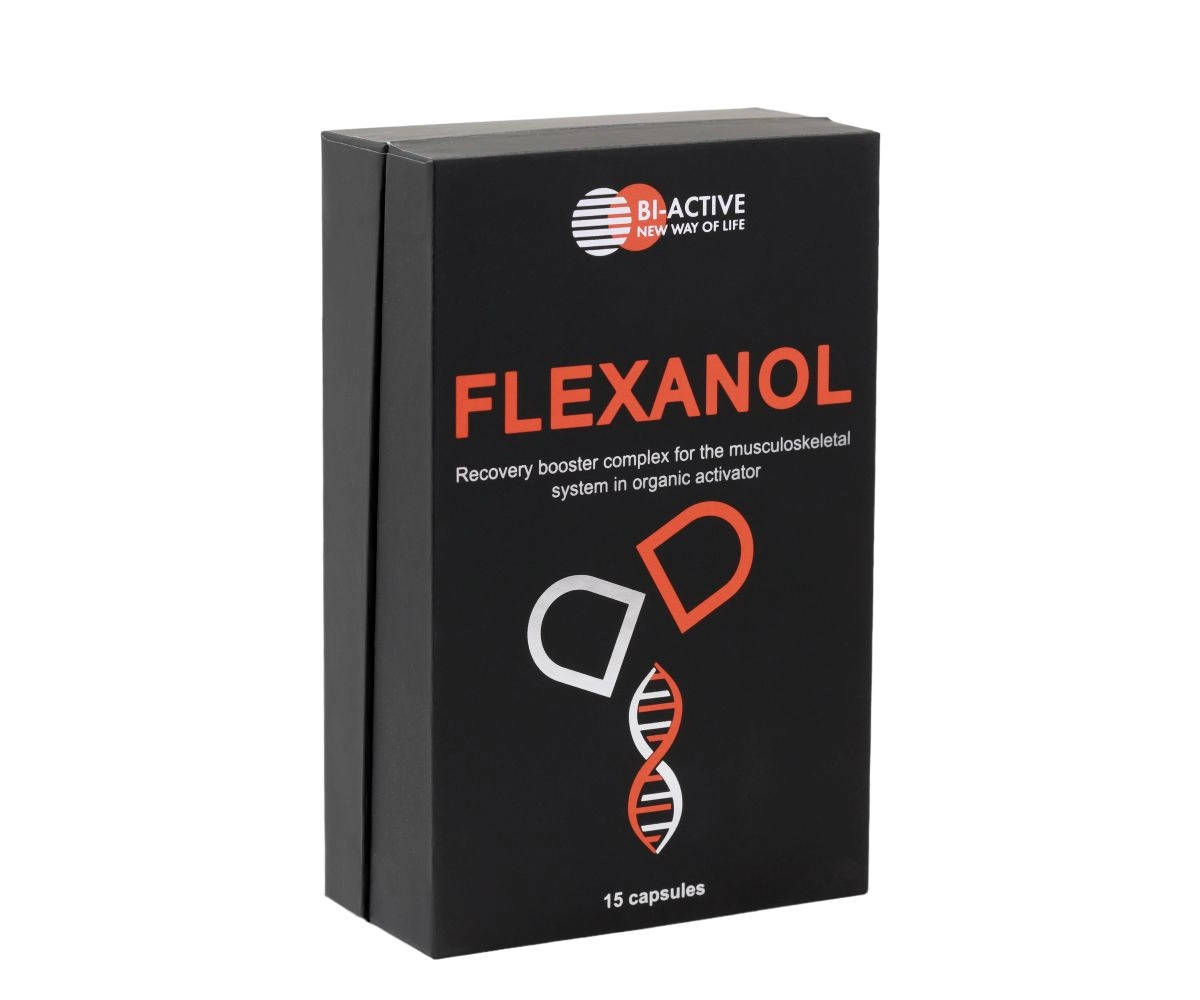 Флексанол — инновационный комплекс на основе липосомной технологии, разработанный для восстановления и защиты суставов. Уникальная форма липосомных микро-капель обеспечивает точечную доставку активных компонентов непосредственно в клетки-мишени сустава с биодоступностью до 95%. В состав входят запатентованные ингредиенты мирового уровня: Boswellin Forte™, Flexigo™, CYNATINE FLX™, ExceptionalHYAL Jump™, гиалуроновая кислота, экстракт фукуса, а также комплекс натуральных масел. Флексанол не является лекарственным препаратом и применяется в качестве биологически активной добавки к пище.
