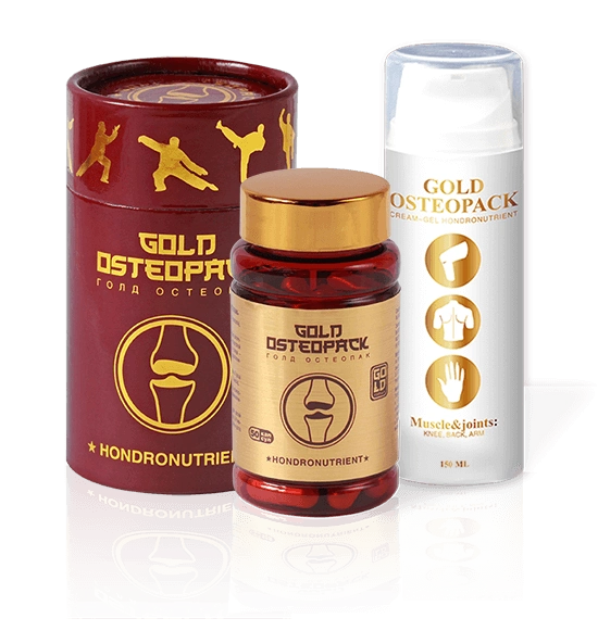 Голд Остеопак (Gold Osteopack) — эффективный комплекс двойного действия из би-активных хондронутриентов для решения любых проблем с суставами. Продукт включает капсулы для приёма внутрь и крем-гель для наружного применения, которые работают одновременно в двух направлениях: на органы — стимулируя их активно вырабатывать питательные вещества для суставов, и на суставы — для снятия боли, спазмов, отёков, воспаления и нормализации работы суставной сумки. Голд Остеопак — это биореставратор суставов, который активизирует естественные процессы питания и самовосстановления организмом синовиальной оболочки, синовиальной жидкости, суставов и хрящей.