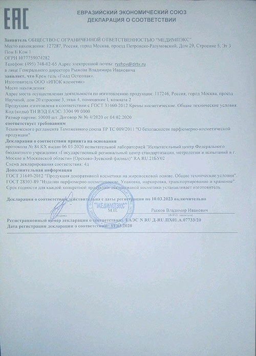 Голд Остеопак не является лекарственным препаратом. При тяжёлых заболеваниях опорно-двигательной системы рекомендуется применять в комплексе с назначенной ревматологом терапией. Продукт содержит хитозан из крабов и изофлавоны сои — лицам с аллергией на эти компоненты следует проявлять осторожность. Крем-гель предназначен только для наружного применения — не допускать попадания на слизистые оболочки и в глаза.