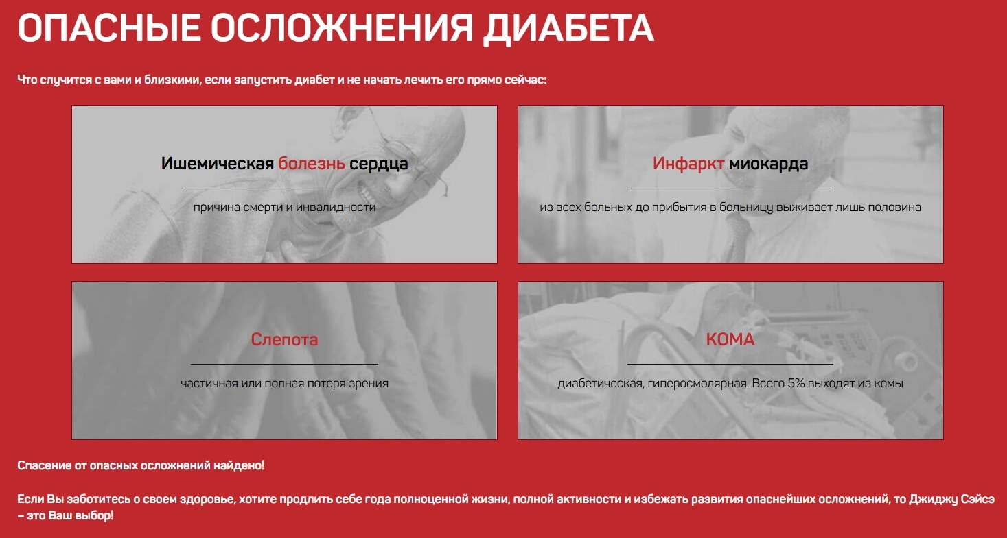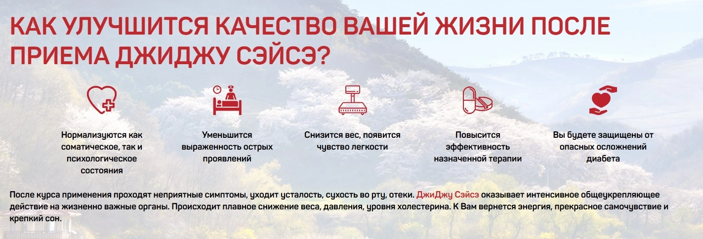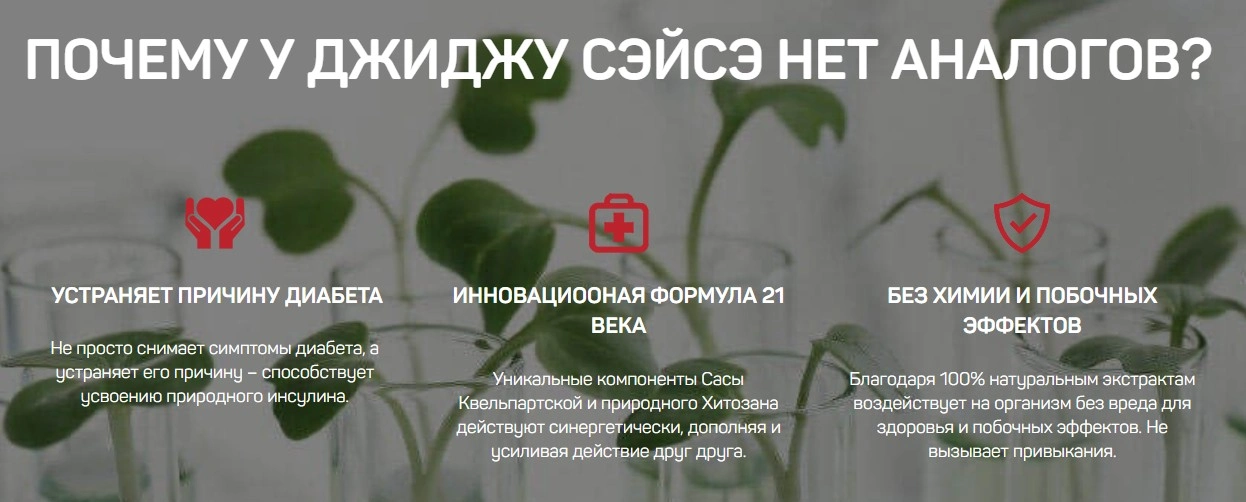 Действие компонентов в составе ДжиДжу Сэйсэ, во-первых, стимулирует работу инсулиновых рецепторов клеток, нормализуя уровень сахара в крови. Во-вторых, блокирует повышение уровня сахара после еды, даже при нарушении диеты. Параллельно происходит очищение клеток от ядовитых продуктов гликирования, вызывающих большинство диабетических осложнений. ДжиДжу Сэйсэ нормализует уровень глюкозы, способствует похудению, облегчает контроль аппетита, уменьшает уровень холестерина и укрепляет иммунитет. Все компоненты на 100% натуральны, не вызывают привыкания и побочных эффектов.