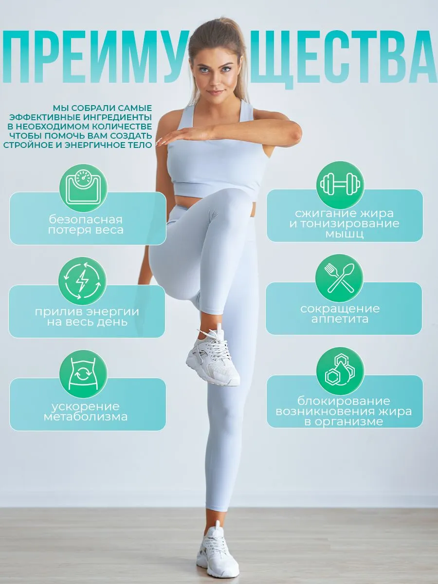 Биологически активная добавка для поддержки снижения веса. Капсулы для похудения на основе натуральных растительных компонентов. Действие направлено на запуск липолиза (расщепления жировых клеток), ускорение метаболизма, подавление аппетита через снижение уровня грелина, выведение токсинов, нормализацию углеводного и жирового обмена. Не является лекарственным средством.