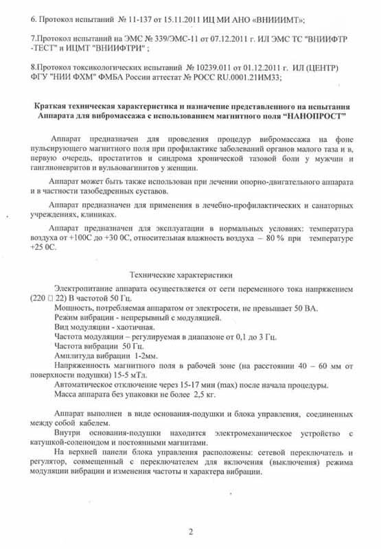 Прибор Нанопрост предназначен для проведения лечебных физиотерапевтических процедур: комбинации вибромассажа с пульсирующим магнитным полем в комплексе терапии заболеваний органов малого таза у женщин. Прибор применяется при воспалительных заболеваниях органов малого таза (ВЗОМТ) в стадии ремиссии, яичниковых дисфункциях, тазовом ганглионеврите, менопаузальном синдроме, недержании мочи, цистите, геморрое и запорах.