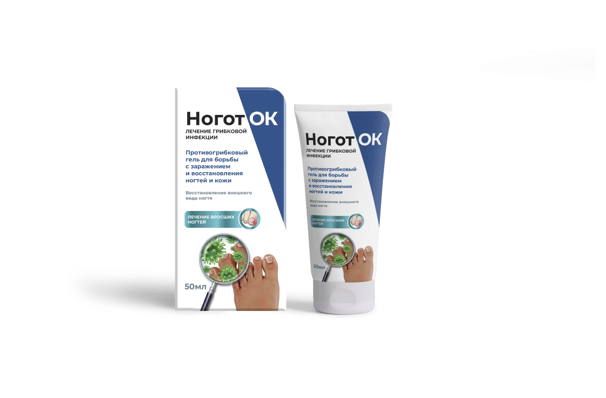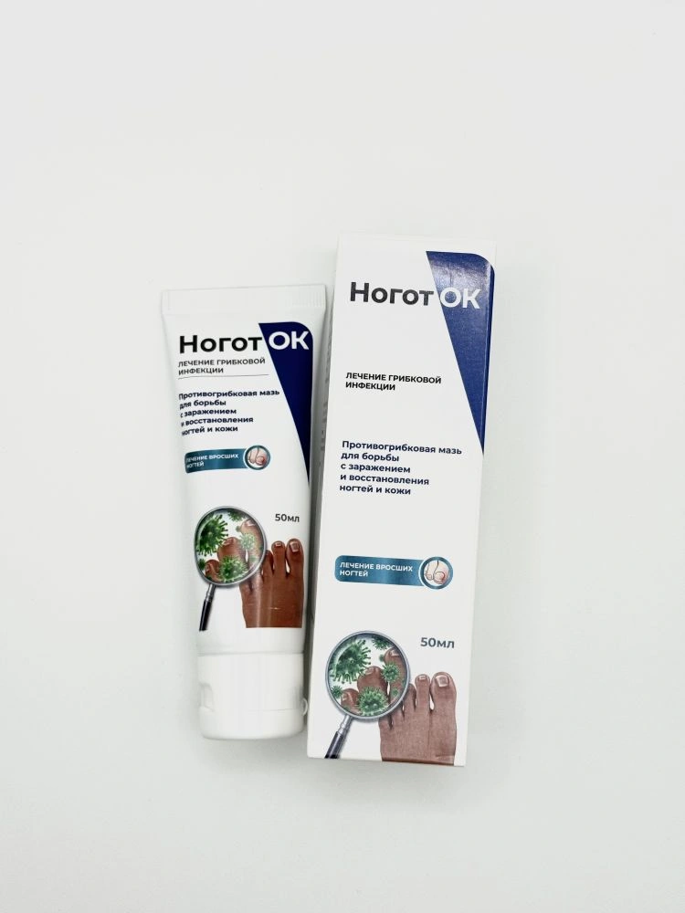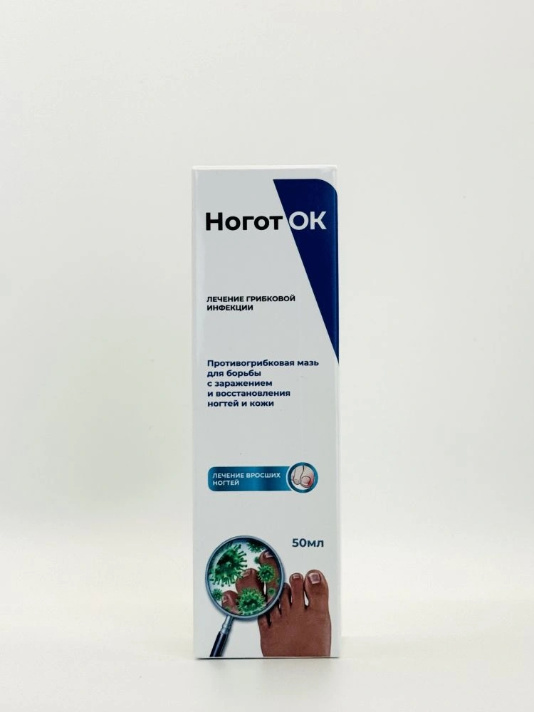 НоготОК — специализированная мазь от грибка ногтей на основе 7 натуральных биоактивных компонентов с мощным противогрибковым, антисептическим и восстанавливающим действием. Средство от грибка ногтей НоготОК содержит уникальный состав: масло мяты, экстракт мумие асиль, экстракт папоротника, экстракт чистотела, масло шалфея, экстракт прополиса и экстракт мускуса бобра. Компоненты действуют синергически: уничтожают грибковые споры и патогенные микроорганизмы, устраняют зуд, шелушение и неприятный запах, восстанавливают повреждённую ногтевую пластину, укрепляют структуру ногтей и предотвращают повторное появление грибка. Мазь от грибка ногтей выпускается в объёме 50 мл, производитель — ООО «Биошера», Россия, г. Красногорск.