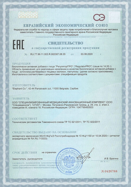 Регулятор ПРО (Regulator pro®) — натуральное средство нового поколения для быстрого и эффективного решения проблемы хронических запоров любой степени тяжести. Продукт содержит два активных компонента: запатентованную французскую формулу Fibregum™ (растворимые пищевые волокна из смолы сенегальской акации) и лактулозу — «золотой стандарт» пребиотиков. Оба компонента обеспечивают двойное действие на кишечник: восстанавливают баланс кишечной микрофлоры и стимулируют регулярную работу кишечника. Регулятор ПРО действует мягко, предсказуемо и не вызывает привыкания. Не является лекарственным препаратом.
