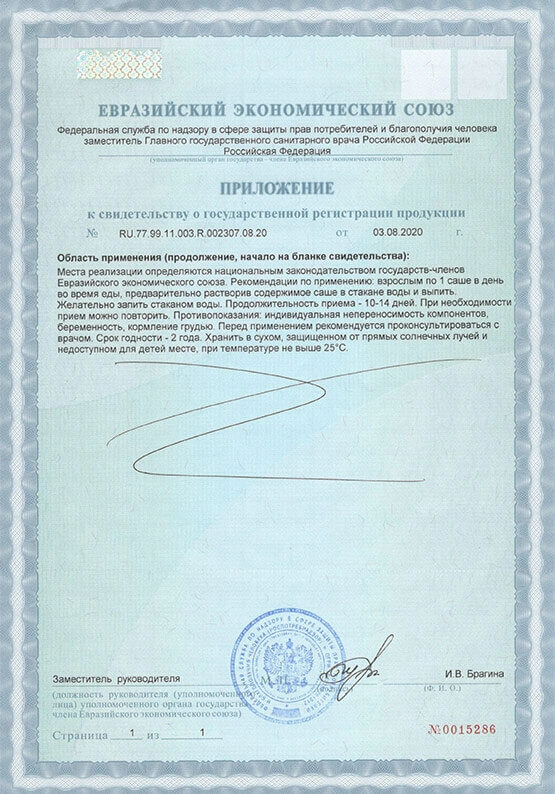Взрослые и дети старше 3 лет: содержимое одного саше растворяют в стакане воды и пьют один раз в день. Обычное время, необходимое для того, чтобы продукт показал эффект, составляет 2–3 дня.