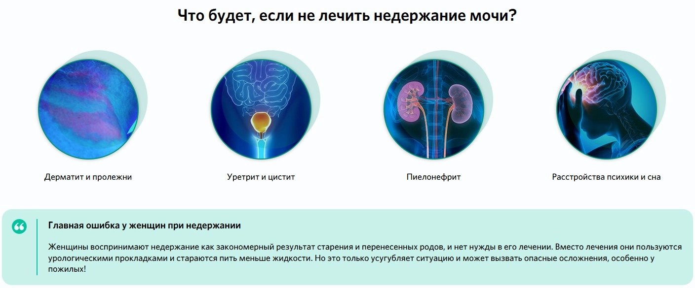 - Впечатляющие результаты исследований — снижение ночного мочеиспускания на 69%, использования прокладок на 66%, стрессового недержания на 52%, императивного на 46%
