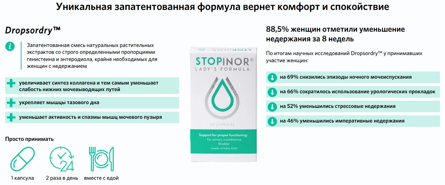 Продукт направлен на устранение главной причины женского недержания — ослабления мышц тазового дна. С возрастом, после беременности и родов, в период менопаузы мышцы быстро теряют эластичность, что приводит к подтеканию мочи, частым ночным мочеиспусканиям и стрессовому недержанию. Стопинор позволяет восстановить контроль над мочеиспусканием в домашних условиях, без специальных упражнений, физиотерапии и операций. По итогам клинических исследований Dropsordry™, 88,5% женщин отметили уменьшение недержания за 8 недель. Продукт произведён в Европе на современном GMP-производстве.