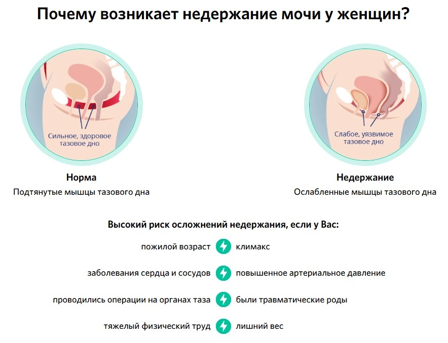 - Стрессовое недержание мочи — подтекание при кашле, чихании, смехе, физической нагрузке