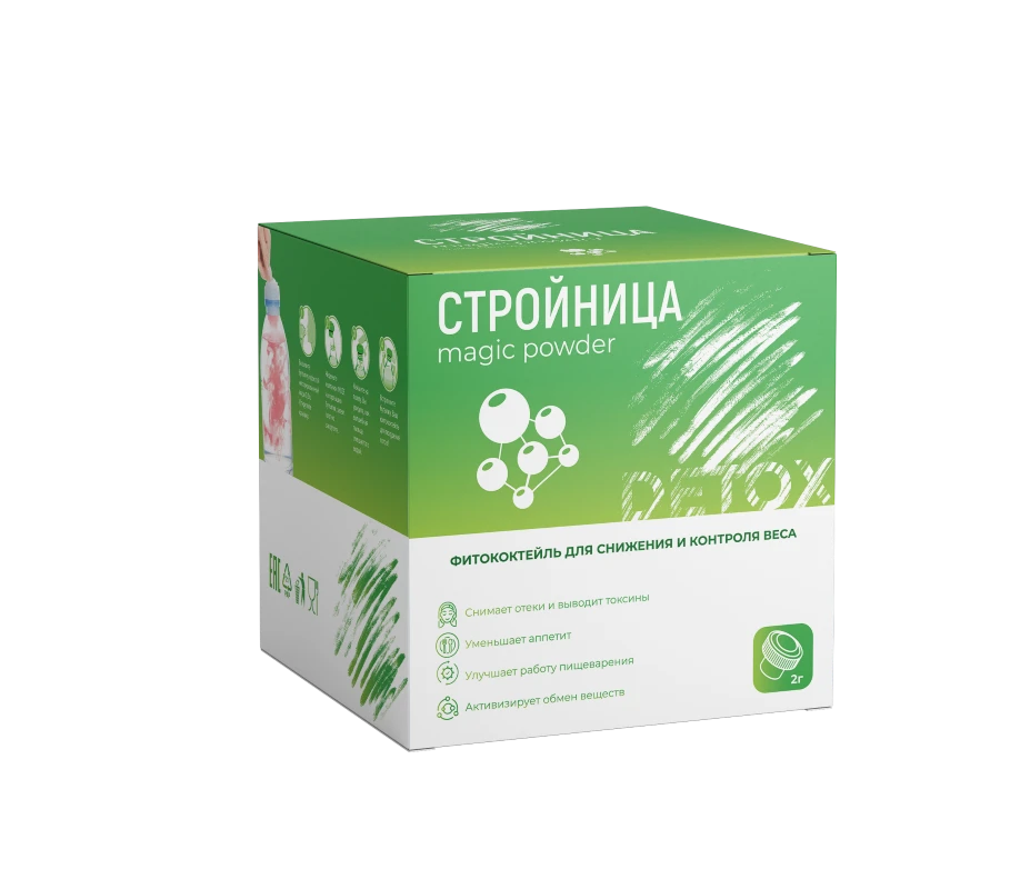 Стройница — инновационный фитококтейль для похудения в форме порошка с уникальной системой приготовления: специальный колпачок с помпой надевается на любую бутылку воды 0,5 л, одно нажатие — и напиток для сжигания жира готов к употреблению. Фитококтейль для похудения Стройница содержит 16 активных компонентов: экстракт африканского манго, яблочный экстракт, экстракт зелёного чая, экстракт листьев лотоса, форсколин, анлин, экстракт японского женьшеня, ресвератрол, экстракт гуараны, экстракт ягод каму-каму, экстракт грейпфрута, L-карнитин, экстракт готу кола, экстракт гарцинии камбоджийской и витамины Е, В12, С, В6, В1, В2. Формула действует через три механизма одновременно: подавление аппетита (африканское манго, гарциния, яблочный пектин), ускорение метаболизма и сжигание жиров (зелёный чай, форсколин, гуарана, L-карнитин), повышение энергии и тонуса (женьшень, готу кола, витамины группы В).