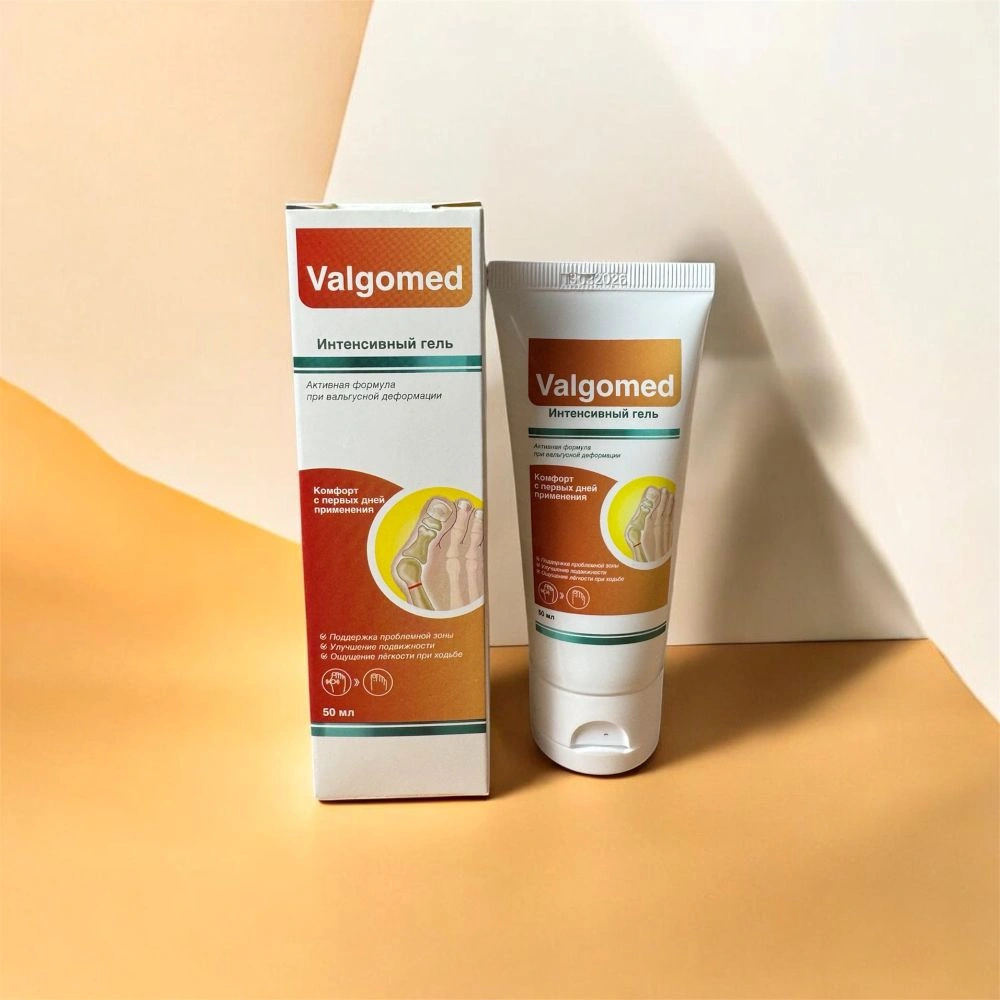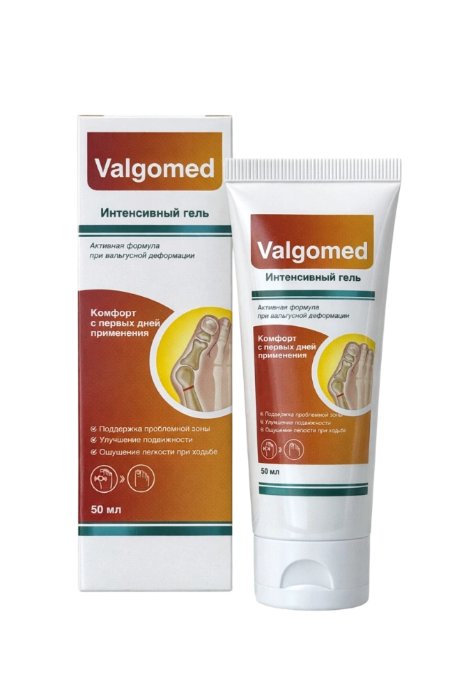 Вальгомед (Valgomed) — специализированный гель от вальгусной деформации большого пальца стопы с комплексом из 10 активных компонентов для снятия боли, дискомфорта, отёчности и усталости в проблемной зоне, смягчения огрубевшей кожи и поддержки микроциркуляции. Средство от вальгуса Вальгомед содержит: аллантоин, ментол, экстракт конского каштана, экстракт хвоща, экстракт крапивы, экстракт подорожника, экстракт лопуха, экстракт зверобоя, экстракт мяты и эфирное масло чайного дерева. Формула сочетает охлаждающее обезболивающее действие (ментол, мята) с восстановлением тканей (аллантоин, подорожник), улучшением кровообращения (конский каштан) и укреплением эластичности (хвощ). Гель от вальгусной деформации выпускается в объёме 50 мл и подходит для ежедневного длительного использования. Производитель: ООО «Биошера», Россия, г. Красногорск.