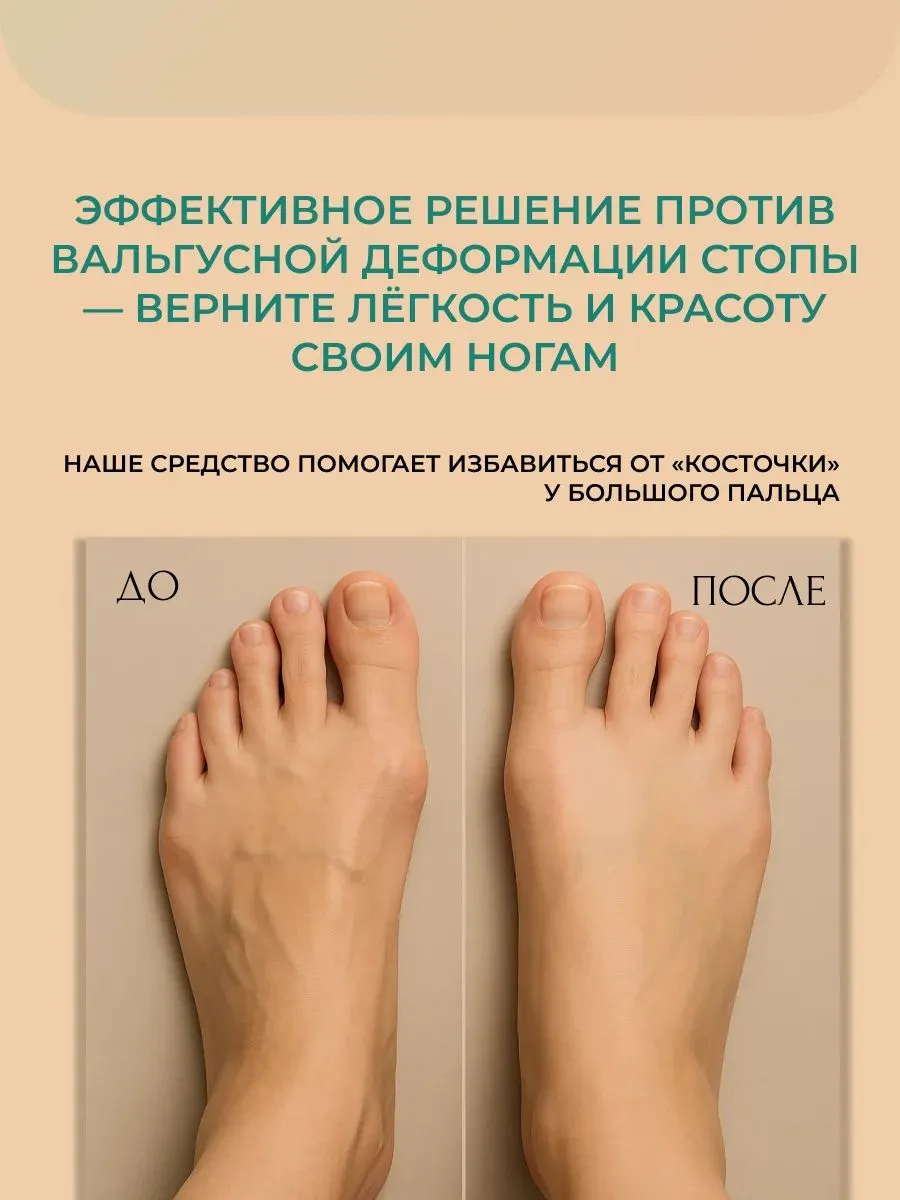 Наружное косметическое средство для ухода за кожей стопы в области вальгусной деформации. Гель от вальгусной деформации с 10 активными компонентами для снятия дискомфорта, смягчения кожи, улучшения микроциркуляции и поддержки эластичности тканей. Не является лекарственным средством. Производитель: ООО «Биошера», Россия, г. Красногорск.