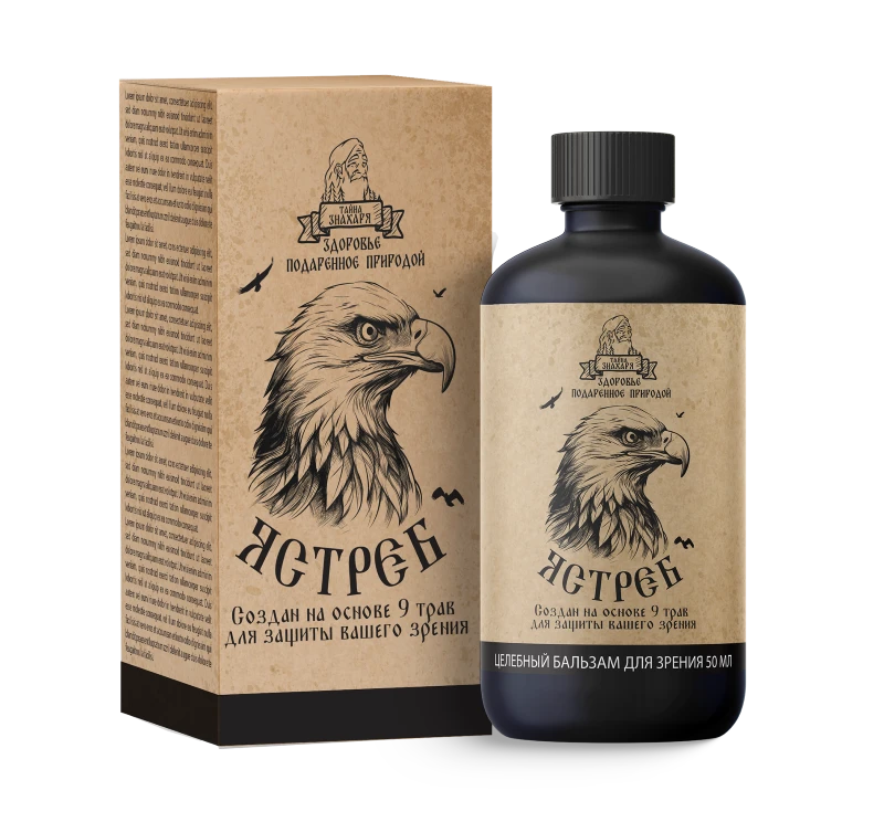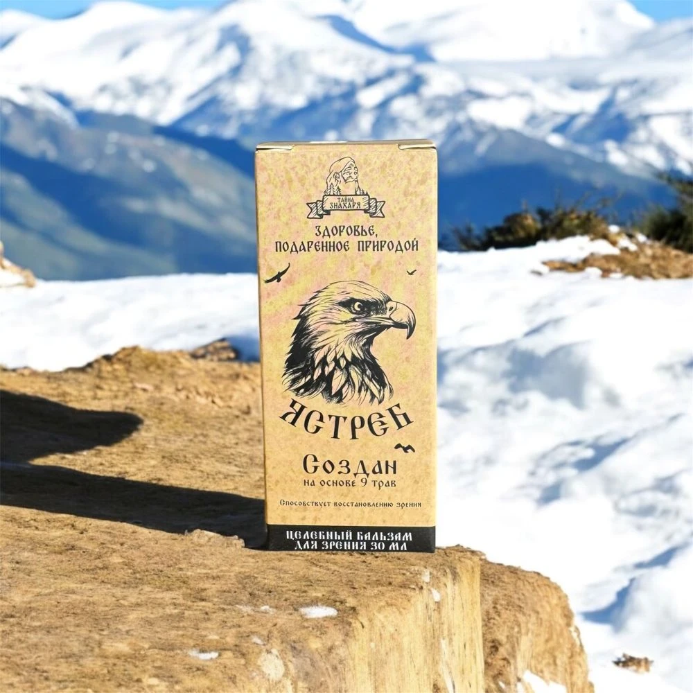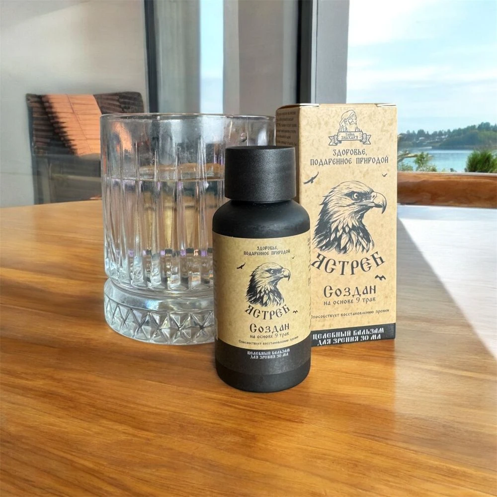 Ястреб — целебный бальзам для зрения на основе натурального алтайского мёда и 14 водных экстрактов лекарственных трав и ягод, разработанный для повышения остроты зрения, улучшения кровоснабжения сетчатки, нормализации глазного давления и снятия усталости глаз. Капли для глаз Ястреб содержат проверенные веками компоненты народной медицины: экстракты очанки, ромашки аптечной, зверобоя, пустырника, бессмертника, календулы, шалфея, чабреца, крапивы, ягод и побегов черники, ягод рябины, плодов шиповника и ягод черноплодной рябины. Издревле считается, что именно это сочетание трав усиливает остроту зрения, оказывает мягкое тонизирующее действие и обогащает организм натуральными витаминами и минералами. Бальзам для зрения выпускается во флаконе 50 мл и принимается внутрь — добавляется в чай, кофе или воду.